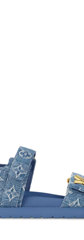 The LV Sunset flat comfort sandal is revisited this season in Monogram denim, which complements its relaxed design. This model is characterized by its two adjustable velcro straps, one of which is signed with a gold-toned LV Twist accessory. The coordinating leather trim and micro outsole create a refined look.